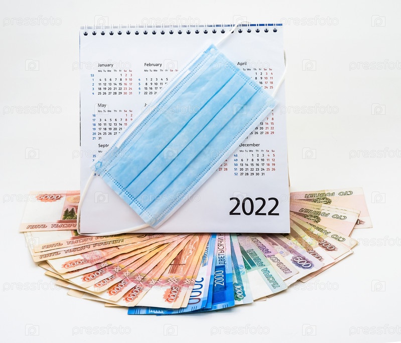 Медицинская маска и календарь 2022. Маска на календаре и российские деньги. Календарь 2022 и бумажные рубли