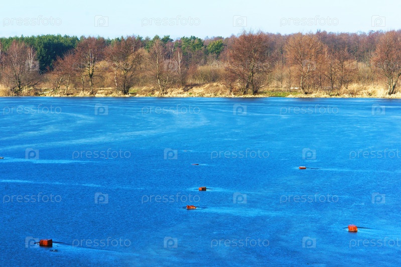 Замерзшее озеро в солнечный день, зимний лед пруда