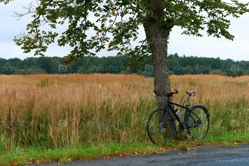Путешествие на велосипеде, черный велосипед у дерева возле дороги