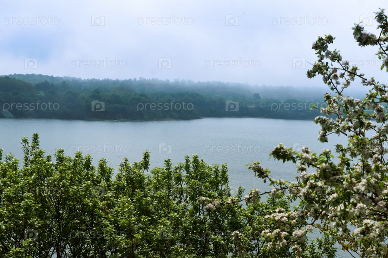 Яблони, дерево, весна, цветок, цветы, дерево, туман, озеро, Берег