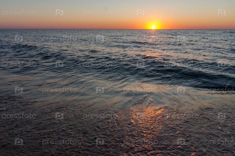 Солнце садится за морской горизонт. Закат на берегу моря