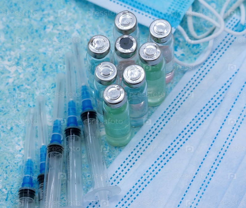 Медицинские инструменты на синем фоне. Ампула лекарства и шприц. Медицинская маска и вакцина