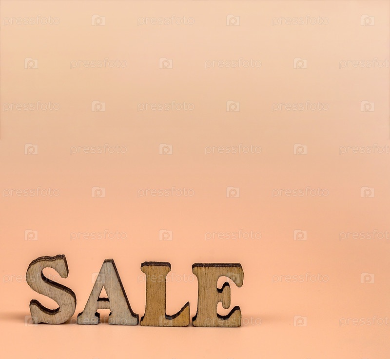 Продажа больших букв, акция. Распродажа со скидкой. Скидка на деревянные буквы на оранжевом фоне