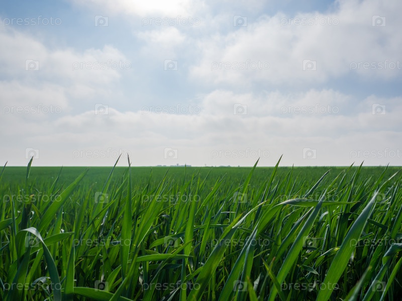 Крупный план ростков пшеницы в поле на фоне неба. Поле с зеленой травой под летним небом с облаками