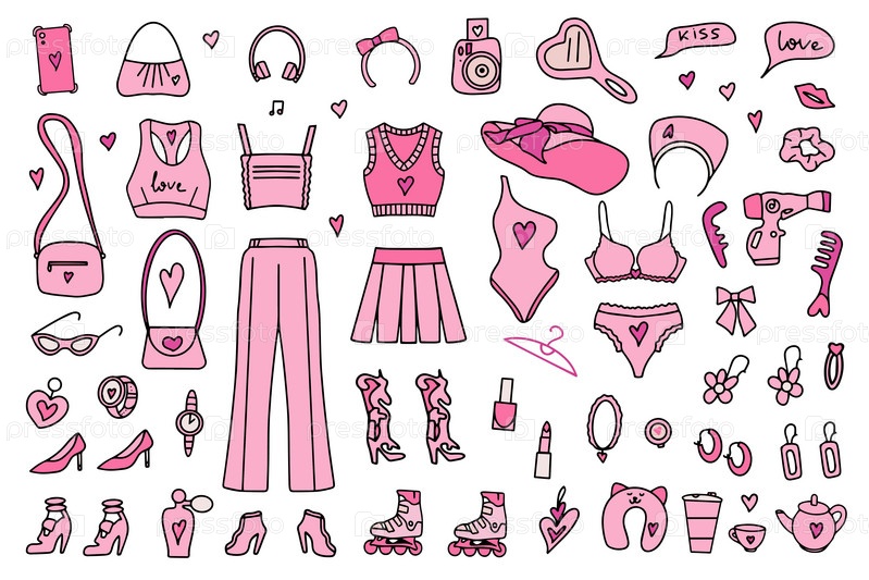 Набор Барбикор. Розовый модный комплект, эстетические аксессуары для розовых кукол, косметика и одежда. Векторная иллюстрация