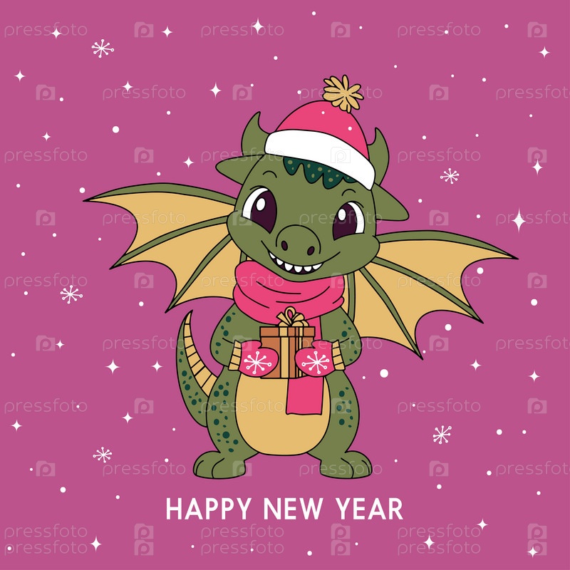 Рождественская открытка с милым зеленым драконом, символом 2024 года. Забавный зеленый дракон с подарком. Открытка с Рождеством и Новым годом. Вектор