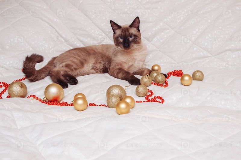 Сиамский кот лежит на белом фоне с рождественским украшением, матовыми и блестящими золотыми шариками и красными бусами, с пустым местом для текстовой концепции поздравительной открытки, украшением елки, новым годом, домашним животным