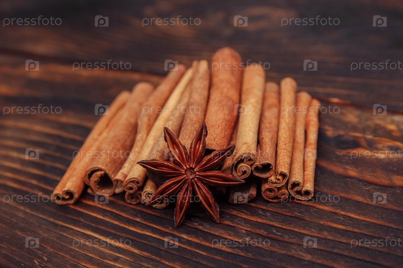 Палочки корицы и звездчатый анис крупным планом на коричневом деревянном столе крупным планом, концепция приготовления пищи и напитков, рождественский глинтвейн и выпечка, специи, приправы и здоровье