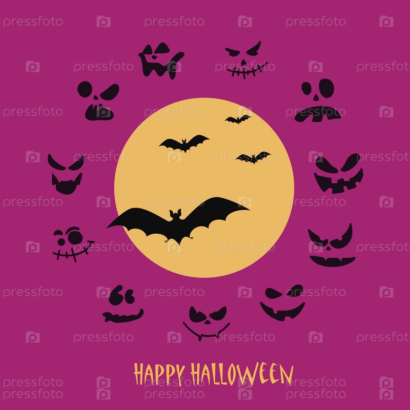 Счастливого Хэллоуина. Жуткие лица, смешные и страшные глаза и рот. Хэллоуин смайлик, мультяшный плоский стиль