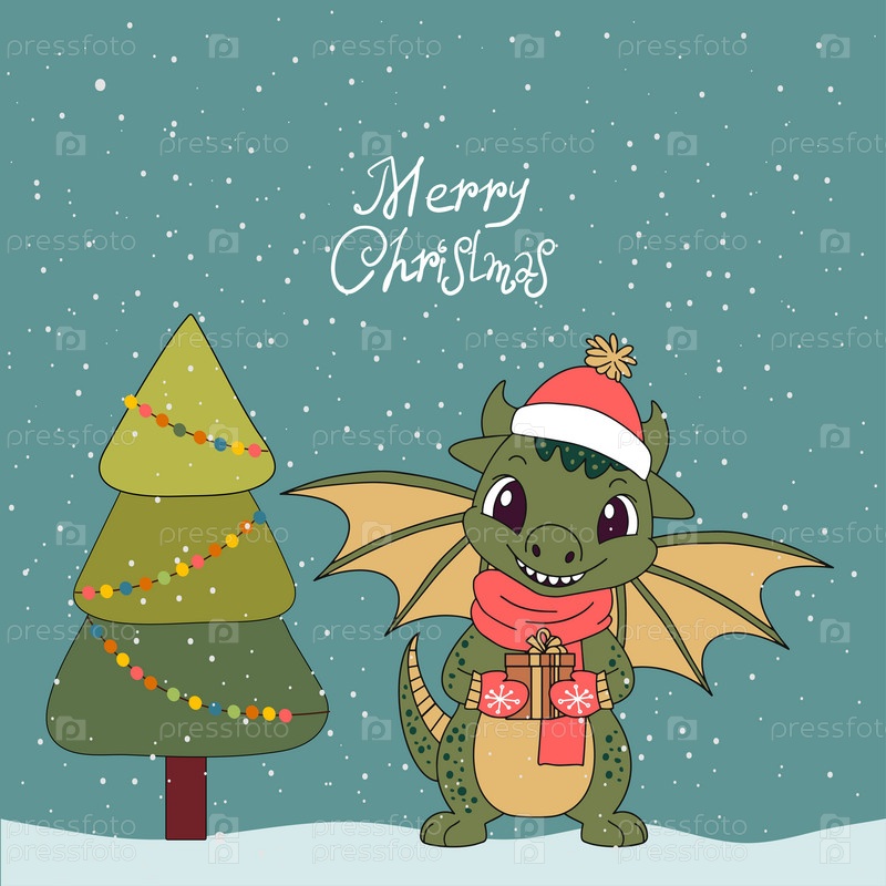 Милый мультяшный зеленый дракон в шапке Санты держит подарок и стоит рядом с рождественской елкой. Новогодняя векторная иллюстрация, поздравительная открытка. Векторная иллюстрация