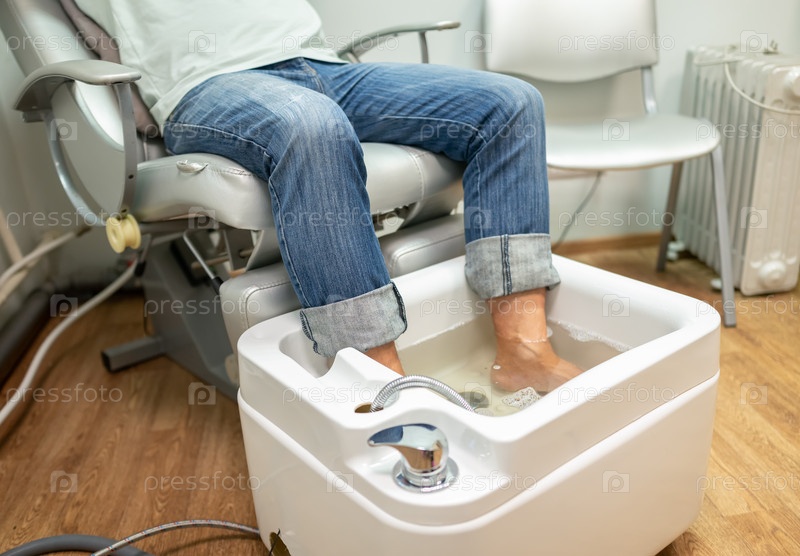 Концепция мужского педикюра, педикюра ног, косметолог делает классический педикюр для пожилого клиента-мужчины