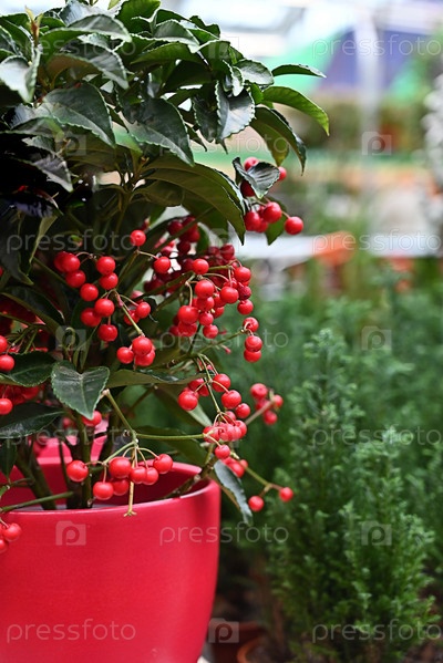 Цветок ардизии с красными ягодами в красном горшке, Цветок ардизии с красными ягодами в красном горшке