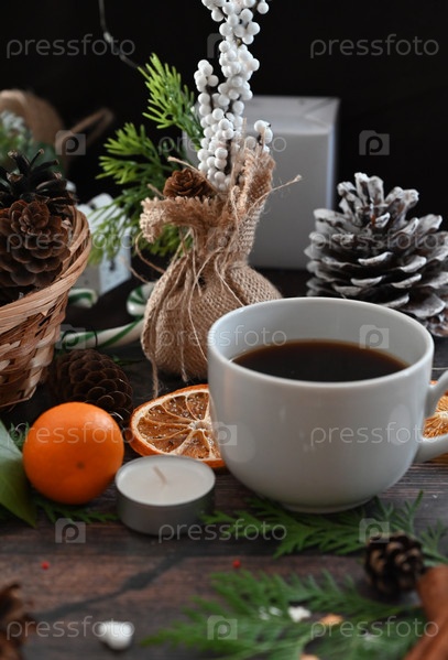 Поздравительная открытка с Рождеством и праздниками, рамка, баннер. Новый год. Рождественские белые подарки ручной работы и красный декор на светлом фоне, вид сверху. Тема зимнего рождественского праздника. Плоская планировка
