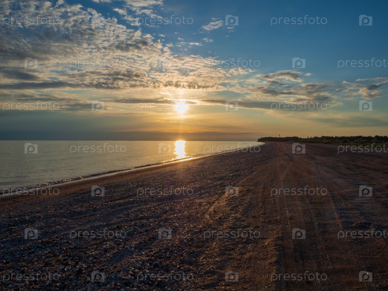 Облачное небо с ярким солнцем над морем и пустынным пляжем. Морской пляж перед закатом