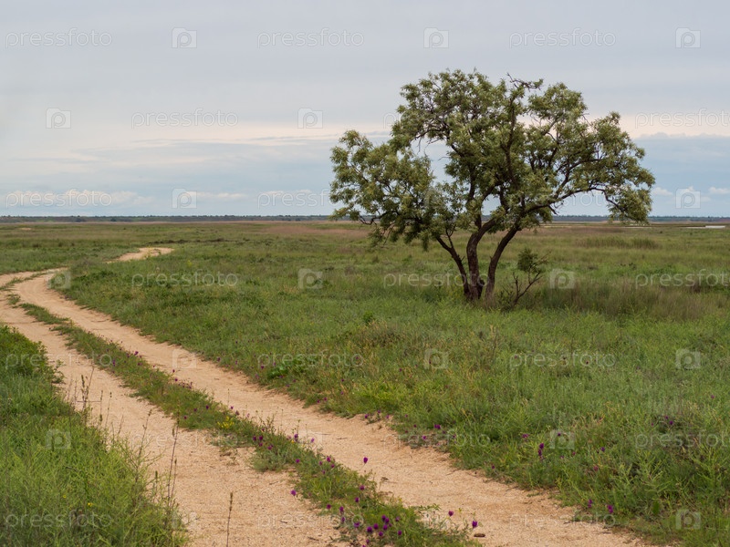 Одинокое дерево в весенней степи возле грунтовой дороги на фоне неба