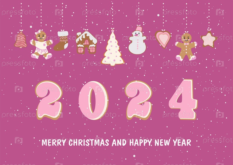 Открытка с Рождеством и Новым 2024 годом. Рождественская открытка с пожеланиями и композицией из праздничных элементов и пряников