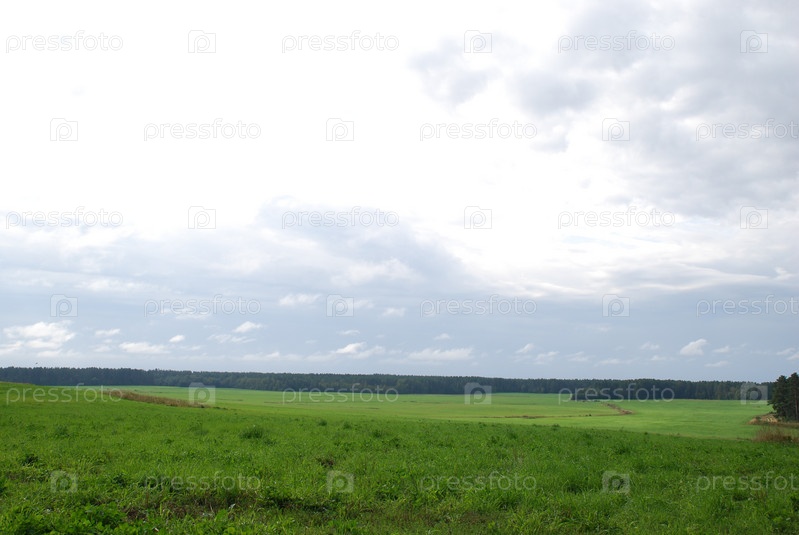 Бело-голубые облака над зеленым полем