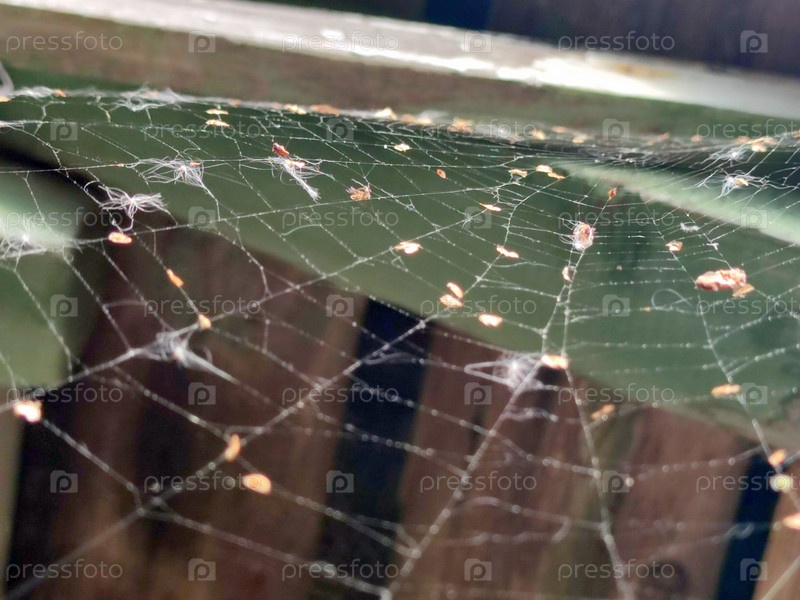 Белая паутина под крышей. Паук сплел тонкую белую паутину под деревянной крышей. В паутину застревают летающие семена одуванчика, семена березы и другой мусор. В сети нет насекомых