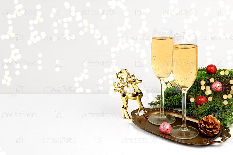 Два бокала шампанского на элегантном праздничном фоне с еловыми ветками и фигуркой оленя. Рождественский и новогодний макет для дизайна и демонстрации продукции, концепция сочельника,