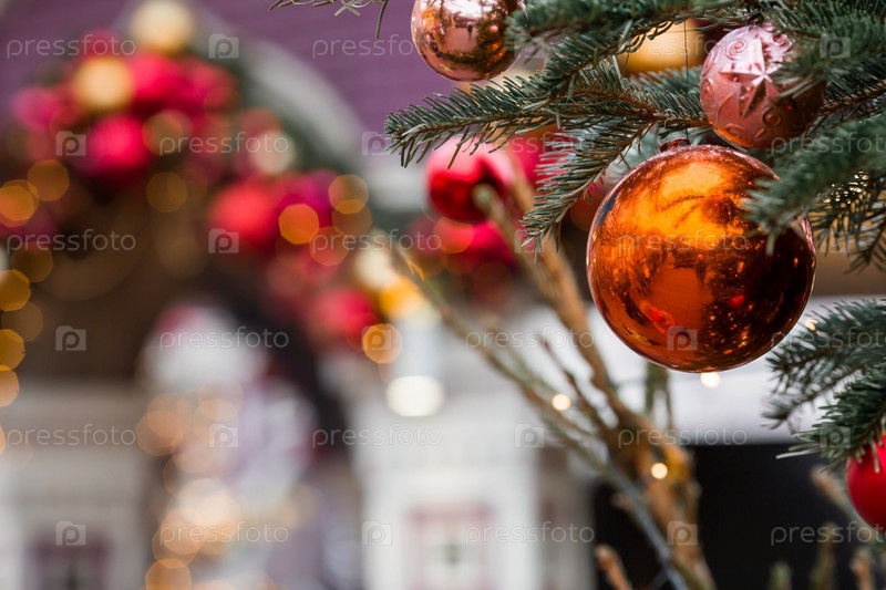 Москва, Площадь Революции. Рождественское украшение улиц. Красивые праздничные украшения на елке в традиционных красных и золотых тонах. Новогодняя открытка 2024