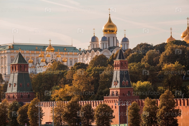 МОСКВА, РОССИЯ - 26 СЕНТЯБРЯ 2023 г.: Вид на Москву осенним вечером на закате. Кремлевские башни. Большой Кремлевский дворец, Успенский и Благовещенский соборы. Популярная туристическая достопримечательность