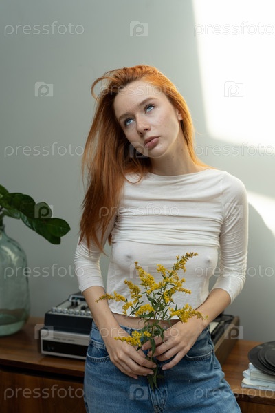 Портрет молодой красивой женщины с рыжими волосами в студии