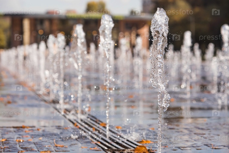 В городе аномально жаркая осенняя погода. Струи воды фонтана в парке Музеон в Москве. Россия, Москва, сентябрь 2023 г