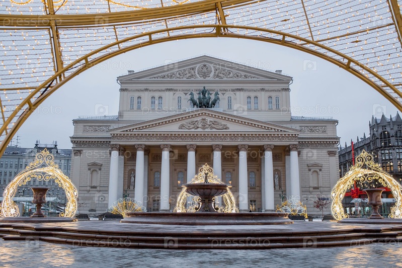 Новый год. Рождественские украшения на улицах Москвы. Рождественские каникулы, зимний пейзаж. Большой театр в центре Москвы. Россия, Москва, 2023 г