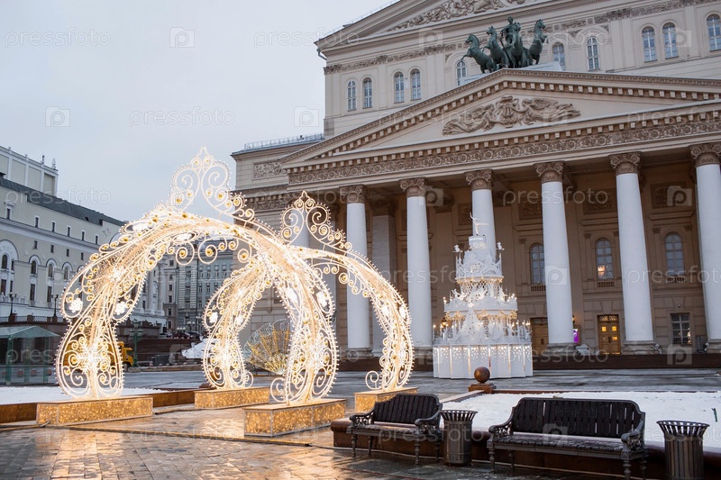 Новый год. Рождественские украшения на улицах Москвы. Рождественские каникулы, зимний пейзаж. Большой театр в центре Москвы. Россия, Москва, 2023 г