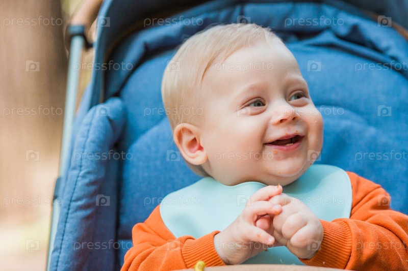 Портрет маленького мальчика 9 месяцев на пленэре. Счастливый ребенок в осеннем парке сидит в коляске. Счастливое детство и материнство