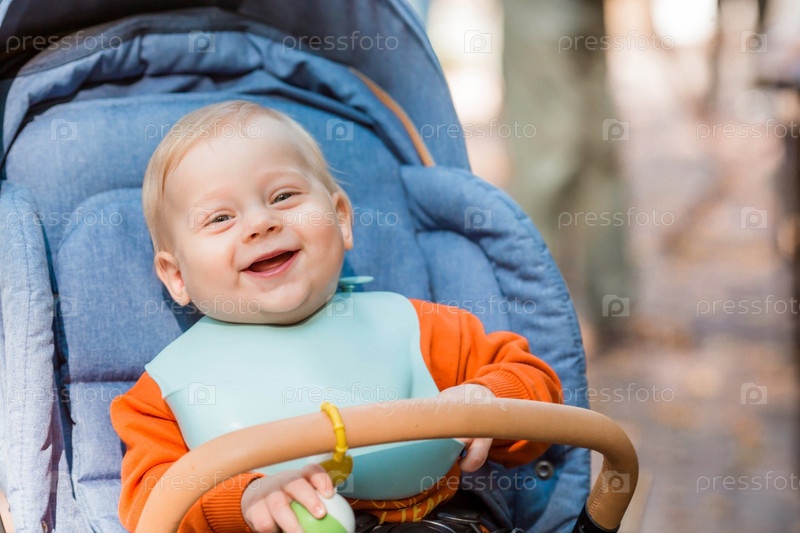Портрет маленького мальчика 9 месяцев на пленэре. Счастливый ребенок в осеннем парке сидит в коляске. Счастливое детство и материнство