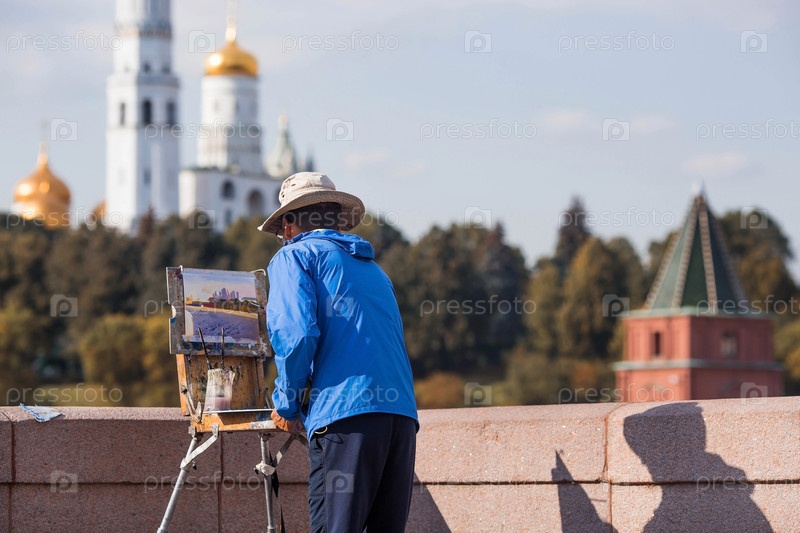 МОСКВА, РОССИЯ - 26 СЕНТЯБРЯ 2023 г.: Художник-мужчина рисует картину в центре Москвы. На картине изображена Москва-Сити солнечным осенним вечером. Творчество и отдых. Популярная туристическая достопримечательность