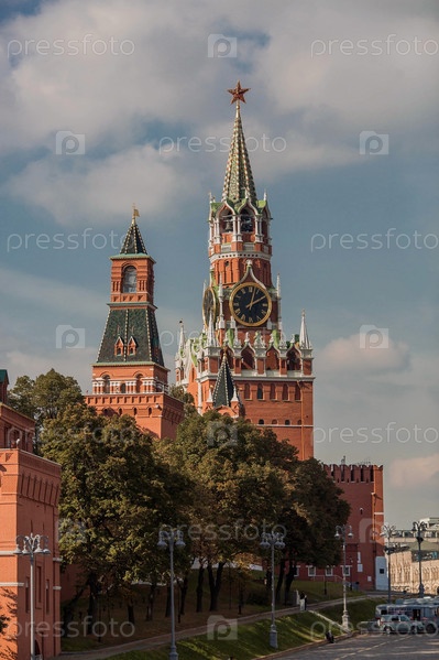 МОСКВА, РОССИЯ - 26 СЕНТЯБРЯ 2023 ГОДА: Спасская башня Кремля на Красной площади солнечным осенним вечером на фоне ярко-голубого неба. Большие часы и куранты на Спасской башне