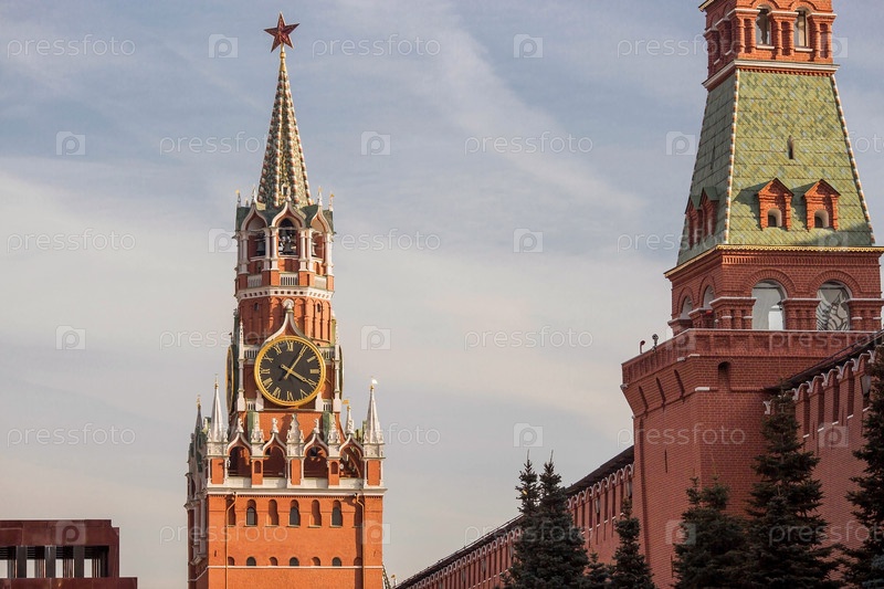 МОСКВА, РОССИЯ - 26 СЕНТЯБРЯ 2023 ГОДА: Спасская башня Кремля на Красной площади солнечным осенним вечером на фоне ярко-голубого неба. Большие часы и куранты на Спасской башне