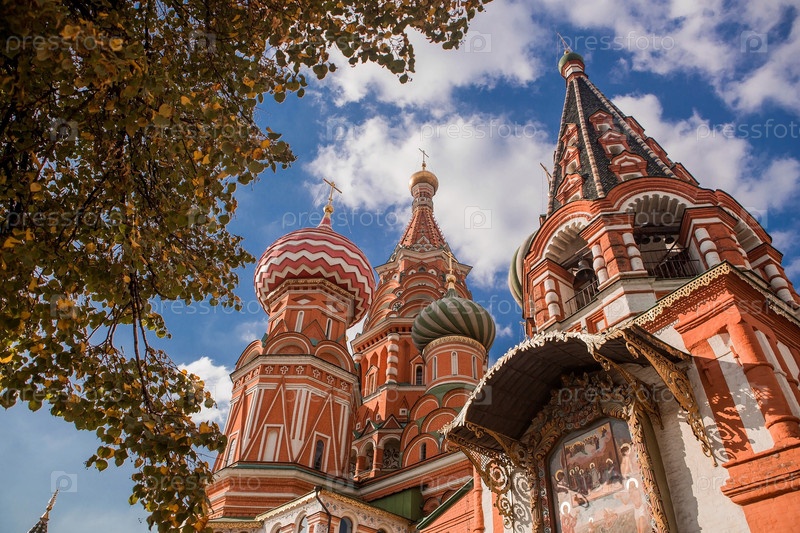 МОСКВА, РОССИЯ - 26 СЕНТЯБРЯ 2023 г.: Собор Василия Блаженного на Васильевском спуске на Красной площади в солнечный осенний день на фоне ярко-голубого неба. Популярная туристическая достопримечательность Москвы