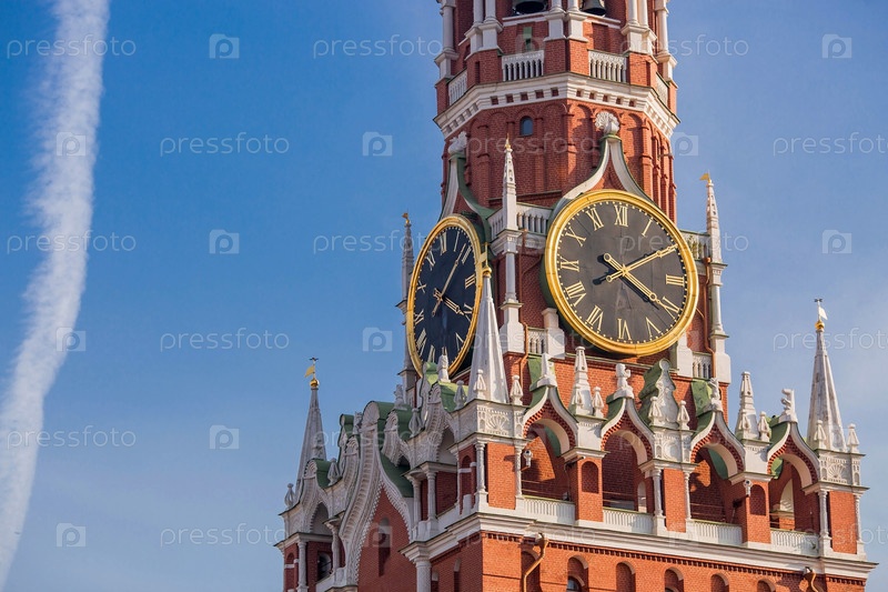 МОСКВА, РОССИЯ - 26 СЕНТЯБРЯ 2023 ГОДА: Спасская башня Кремля на Красной площади солнечным осенним вечером на фоне ярко-голубого неба. Большие часы и куранты на Спасской башне