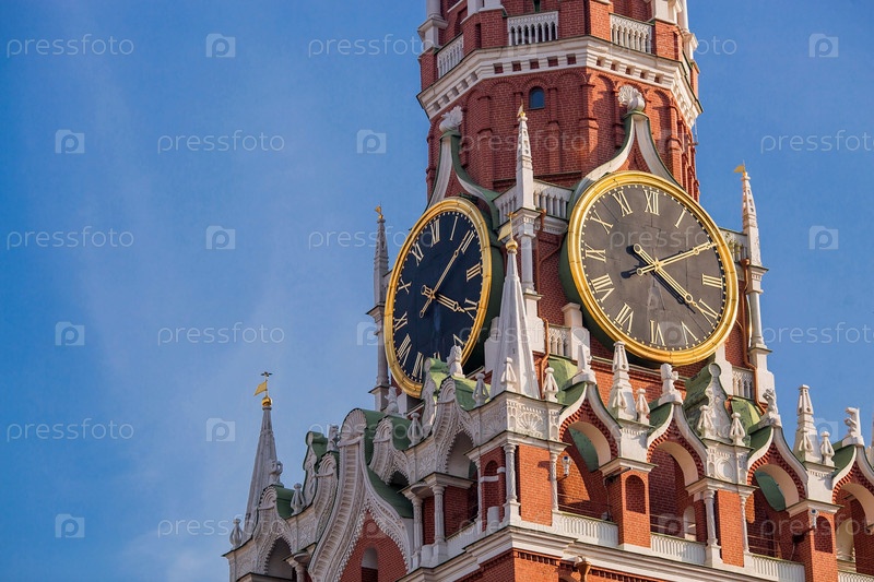 МОСКВА, РОССИЯ - 26 СЕНТЯБРЯ 2023 ГОДА: Спасская башня Кремля на Красной площади солнечным осенним вечером на фоне ярко-голубого неба. Большие часы и куранты на Спасской башне