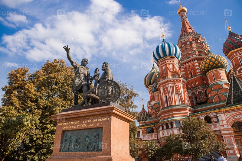 Статуя Кузьмы Минина и Дмитрия Пожарского перед собором Василия Блаженного - Красная площадь в Москве осенью. Россия, Москва, сентябрь 2023 г