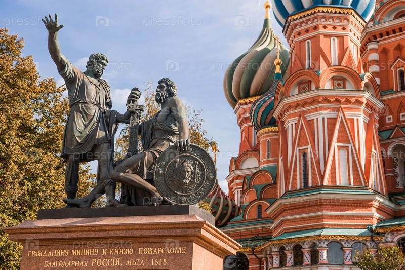 Статуя Кузьмы Минина и Дмитрия Пожарского перед собором Василия Блаженного - Красная площадь в Москве осенью. Россия, Москва, сентябрь 2023 г