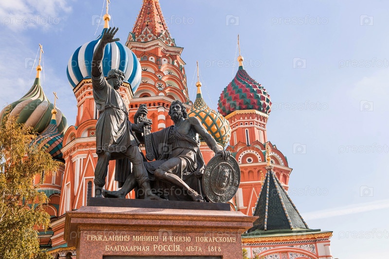 Статуя Кузьмы Минина и Дмитрия Пожарского перед собором Василия Блаженного - Красная площадь в Москве осенью. Россия, Москва, сентябрь 2023 г