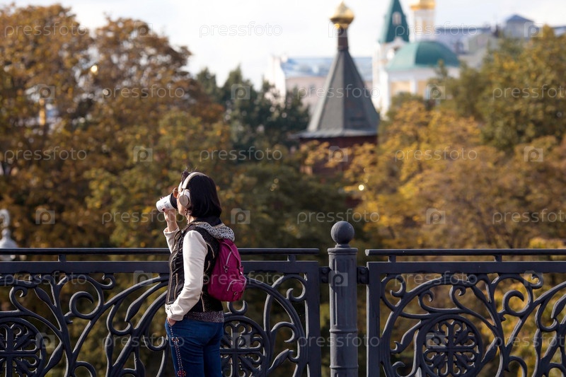 Москва, Россия, 26 сентября 2023 г.: В теплый осенний день девушка гуляет по Патриаршему мосту через Москву-реку и пьет кофе. Девушка со стаканом напитка в руках