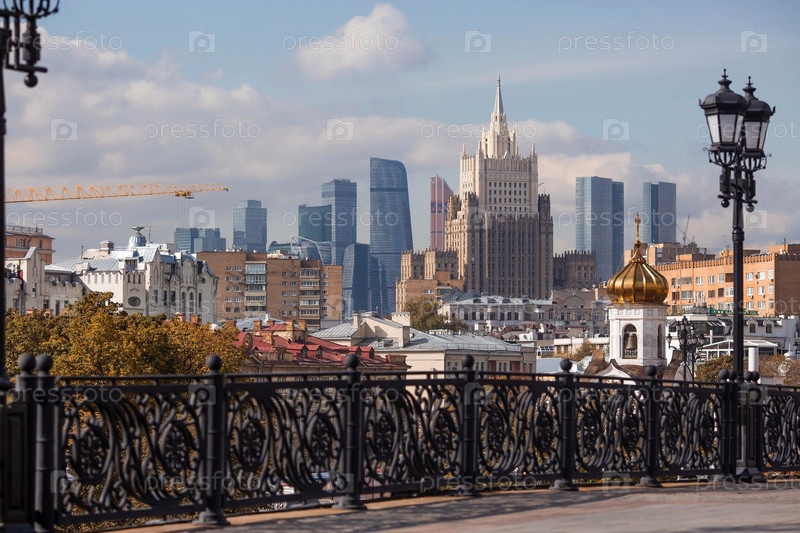 Русский православный собор. Храм Христа Спасителя на фоне Министерства иностранных дел Российской Федерации и Москвы-Сити в солнечный осенний день. Российская Федерация, Москва, сентябрь 2023 г