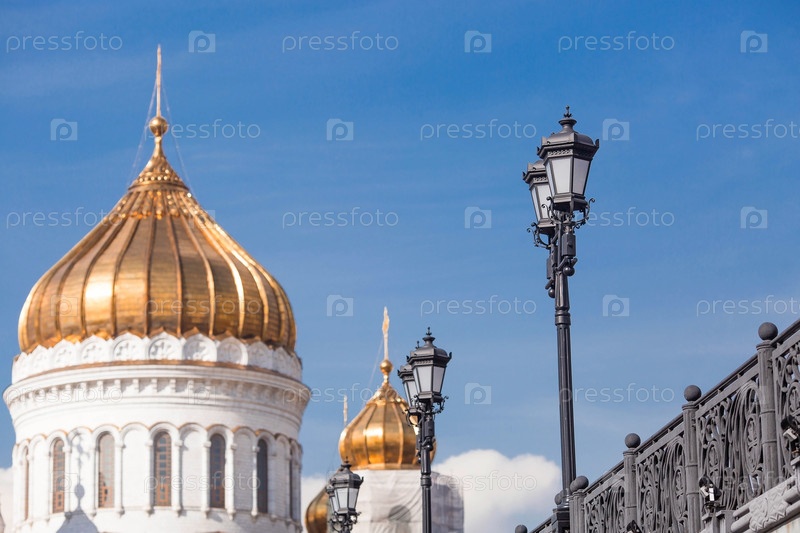 Русский православный собор - Храм Христа Спасителя в Москве на фоне голубого неба в солнечный весенний день. Российская Федерация, Москва