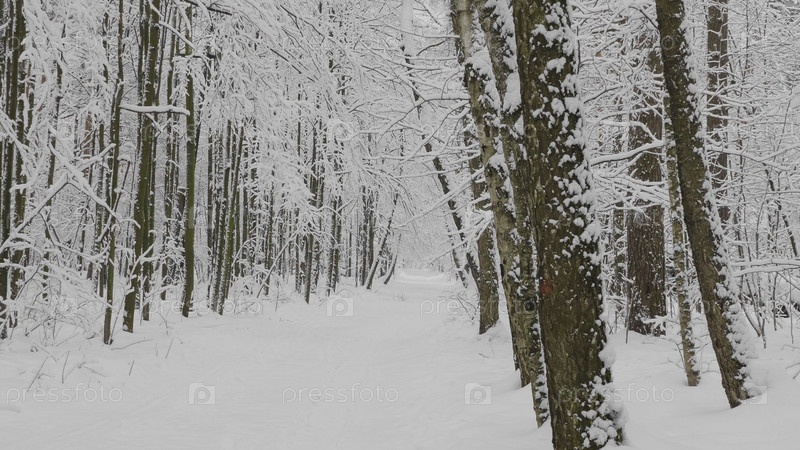 Зимний лес во время снегопада, замедленная съемка