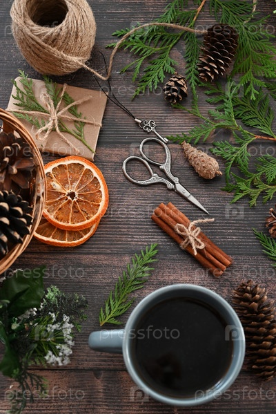 Поздравительная открытка с Рождеством и праздниками, рамка, баннер. Новый год. Рождественские белые подарки ручной работы и красный декор на светлом фоне, вид сверху. Тема зимнего рождественского праздника. Плоская планировка