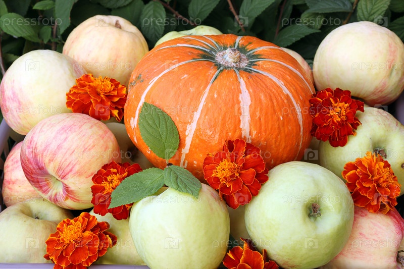 Осенний натюрморт - сочные яблоки, спелая тыква и оранжевые ноготки