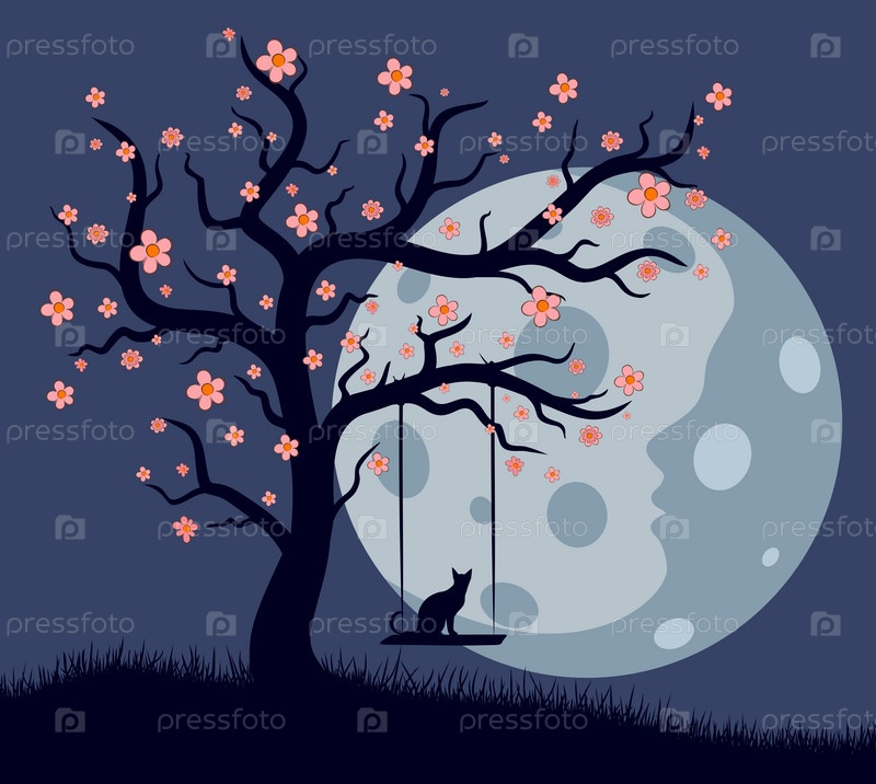 Ночной пейзаж с луной котом и деревом