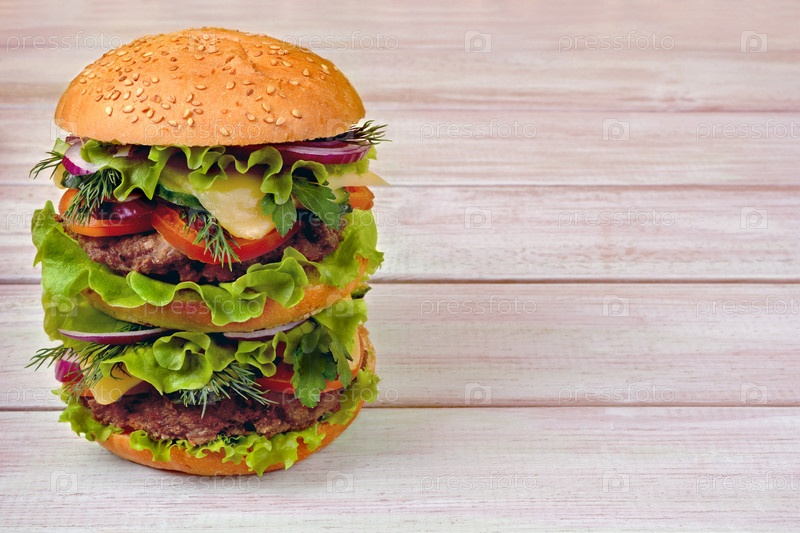 Большой двойной гамбургер с говядиной, салатом и сыром на столе