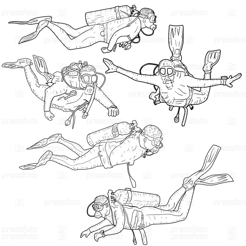 Установите эскиз силуэта аквалангистов на белом фоне