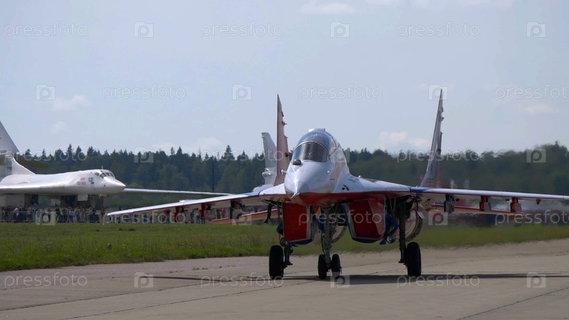 Москва, Россия, Аэродром Жуковский 31 августа 2019 года: пилотажная группа Стриж МиГ-29 выполняет демонстрационный полет международного аэрокосмического салона МАКС-2019, Москва, Россия Аэродром Жуковский 31 августа 2019 года: пилотажная группа Стриж МиГ-